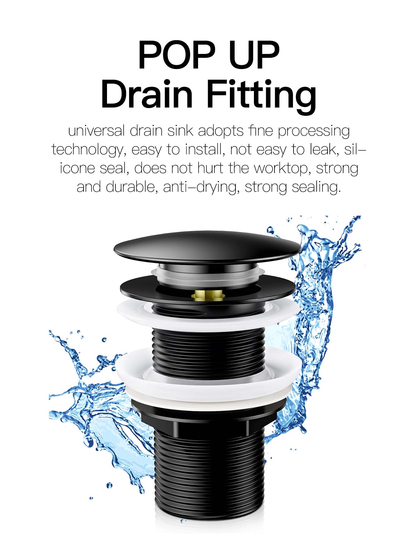 pop up valve adopts standard G1¼" joints, suitable for most standard size sinks or sinks without overflow holes, such as most wall mounted sinks, countertop and under-built sinks, and standard size European style pipes.