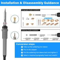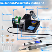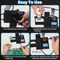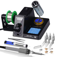 - Soldering iron stand set: soldering station contains 1 x machine, 1 x cleaning box, 1 x cleaning sponge, 1 x soldering gun, 1 x lead-free soldering wire, 1 x tweezers, 6 x soldering iron tips, 1 x adapter, 6 x soldering head, with side mounted soldering wire holder (removable) and the holder of the soldering gun (removable), the complete set is more convenient for you to use in daily life.