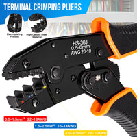 - High-quality materials: crimping pliers are made of high carbon steel, high abrasion resistance, punching resistance, high level of protection, surface waterproof, anti-corrosion, insulation to protect the function of the electronic plug. Crimping pliers terminals are made of high quality brass and nickel plated copper, high temperature resistance, aging resistance, punching resistance, packed storage, durability.