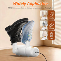 - 【360° Circulating Hot Air】: Electric shoe dryer uses dual core heating element and thermal convection technology, three-dimensional 360° hot air, hot air circulation convection with constant temperature, dries from toe to heel without dead corners. Shoe Dryer uses flame retardant and heat-resistant PP material that does not burn or deform during use and can be used without hesitation.